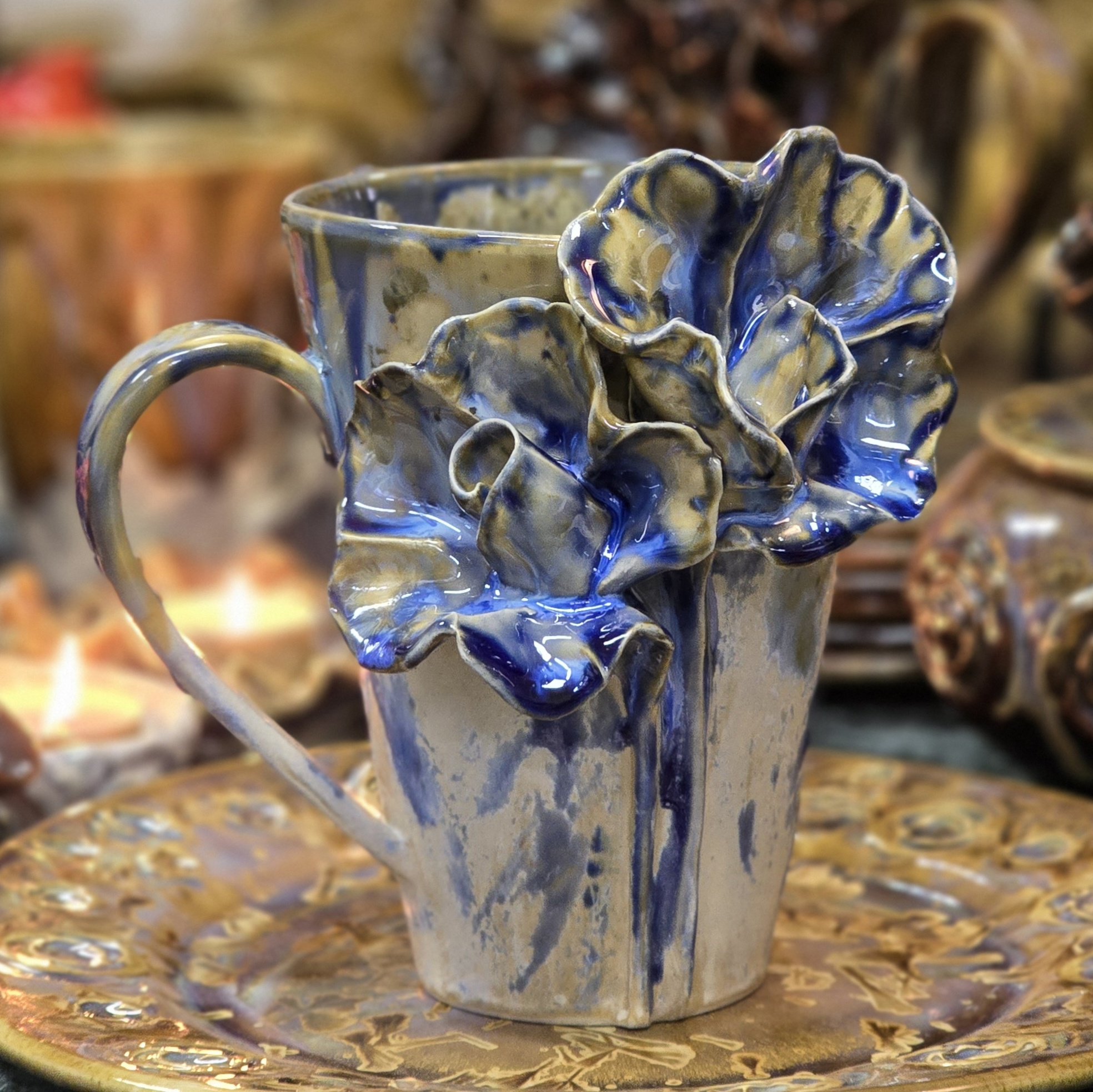 Savilehe tehnikas meisterdatud tass, millele on lisatud käsitsi voolitud roosiõis või mitu. Iga tass on unikaalne ja valmib ainueksemplarina. Omapära ning karakteri toome tassidel esile kuni 8 erineva glasuurikihiga.