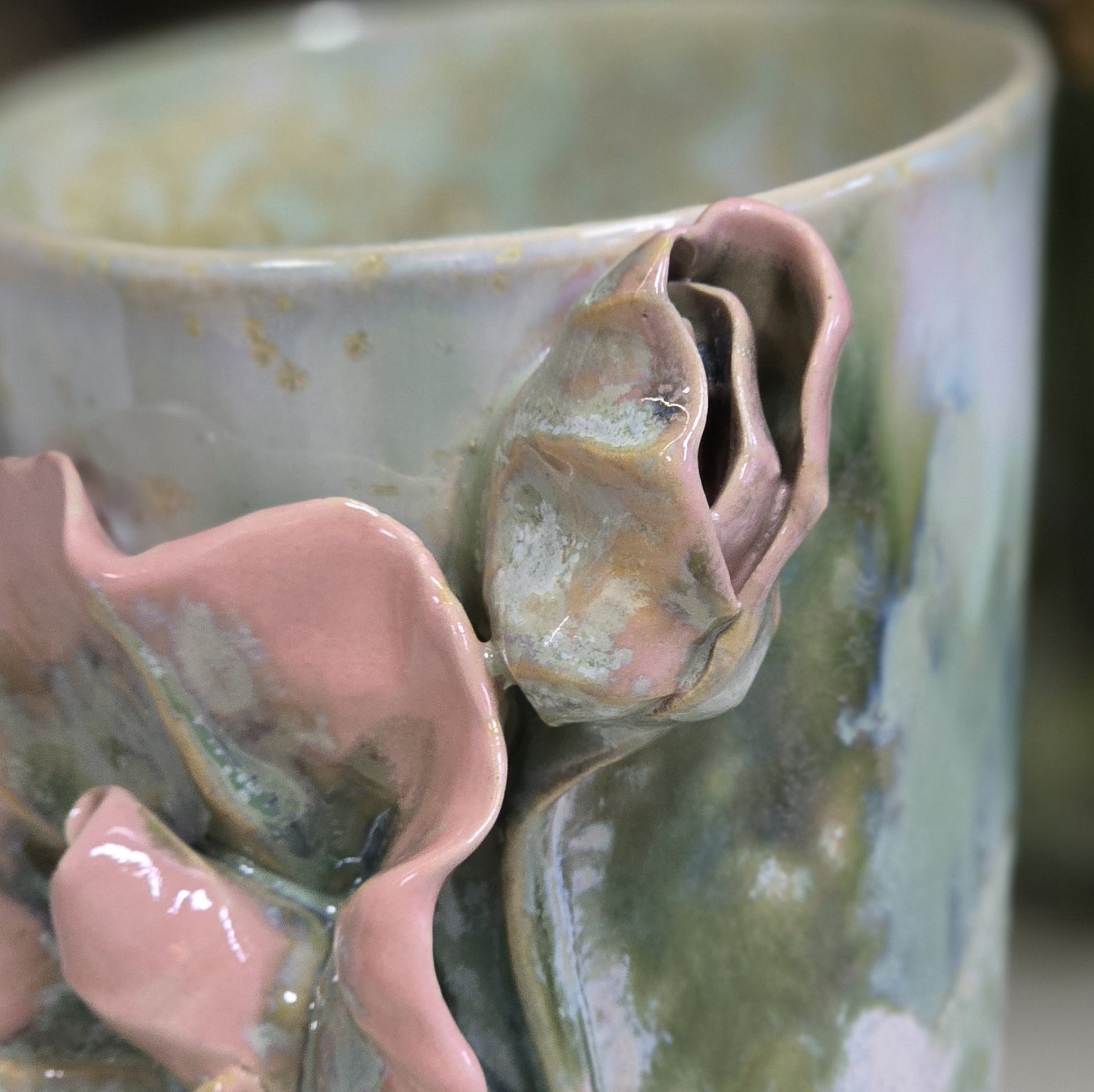 Savilehe tehnikas meisterdatud tass, millele on lisatud käsitsi voolitud roosiõis või mitu. Iga tass on unikaalne ja valmib ainueksemplarina. Omapära ning karakteri toome tassidel esile kuni 8 erineva glasuurikihiga.