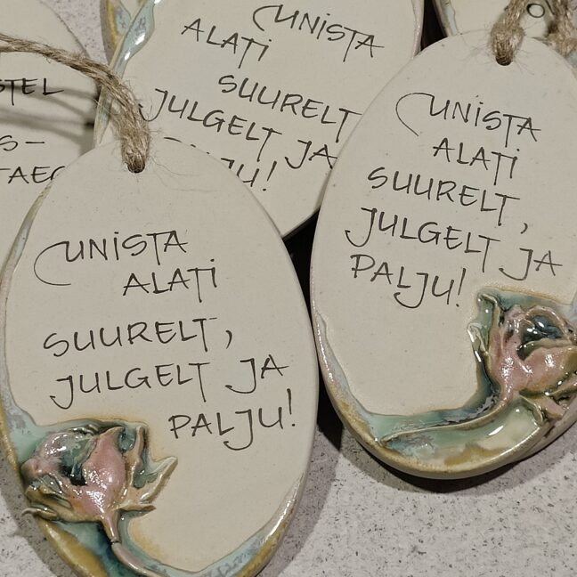 Keraamiline seinaplaat riputamiseks. Plaadi mõõdud 7cm x 12cm.